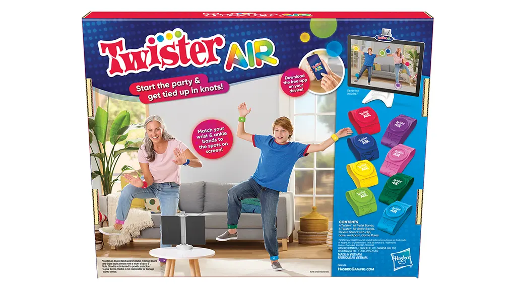 Ačkoli je klasická hra Twister aktivní a rozhodně se neomezuje na stůl, Twister Air tuto aktivní hru zvyšuje stonásobně. Hra úplně opouští hřiště a spinner a přidává náramky a kotníkové pouta, iPad (není součástí) a super zábavnou taneční hudbu. Je to hra na párty řízená aplikací, založená na rozšířené realitě (AR), která kombinuje klasickou hru Twister s trochou arkádového stylu Dance, Dance Revolution (DDR).