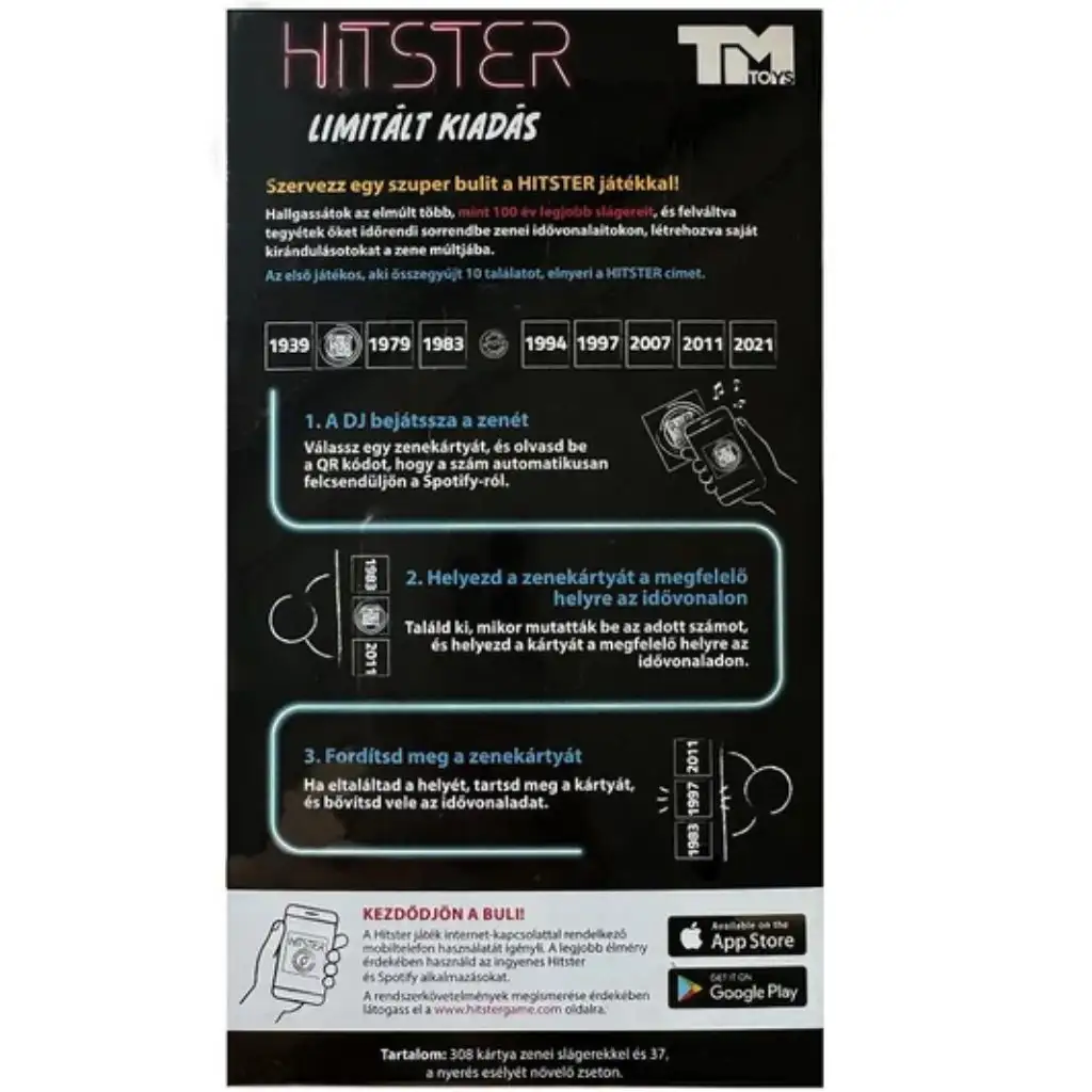 Společenská hra Hitster – Maďarské vydání je vzrušující hudební párty hra, která je dokonalou volbou, pokud chcete uspořádat skvělou párty se svými přáteli! Toto speciální vydání obsahuje 130 maďarských hitů, takže vás zaručeně čeká zábavný zážitek. Během hry si můžete poslechnout více než 300 největších hitů posledních 100 let a zjistit, kdo nejlépe zná hudební časovou osu.
