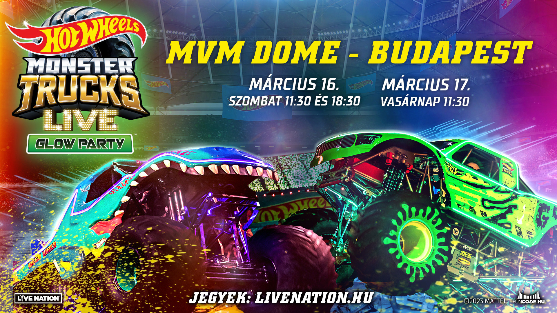 Hot Wheels Monster Trucks Live Glow Party dorazí také do Budapešti! Fanoušci všech věkových kategorií mohou prožít vzrušení, když fandí svým oblíbeným Hot Wheels Monster vozidlům VE TMĚ! Tato jedinečná show zavítá do MVM Dome 16. a 17. března 2024, pouze na 3 představení!