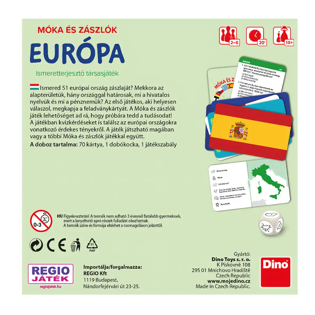 Móka a vlajky - Evropská desková hra je vzrušující a poučná vzdělávací hra, která pomáhá objevovat země Evropy, jejich vlajky a zajímavá fakta o jednotlivých národech. Během hry se účastníci mohou podrobněji seznámit s 51 evropskými zeměmi, včetně jejich vlajek, rozlohy, sousedních zemí, úředního jazyka a měny. Cílem hry je správně odpovědět na co nejvíce kvízových otázek a získat tak karty s hádankami, které odhalují další zajímavosti o zemích.