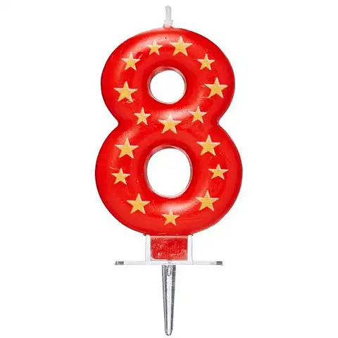 Můžete uspořádat skvělou oslavu k osmým narozeninám, kde samozřejmě nesmí chybět narozeninový dort a svíčka s číslem. Červená vosková svíčka je zdobená žlutými hvězdami, takže je to také vhodný dekorační prvek pro děti. S použitím plastové podstavce lze svíčku snadno zapíchnout do vrchu dortu, který pak bude stabilně stát.