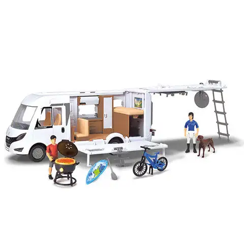 S takovým skvělým obytným autem by se každý rád vydal objevovat velký svět, protože interiér Hymer Camping Vanu by mohl závidět i byt. Detailně zpracovaný interiér sám o sobě nabízí skvělou hru, ale v sadě jsou také takové doplňky, jako je zahradní gril, kolo nebo surf. Hymer Camping Van obytné auto s otevíracími dveřmi, propracovanými interiéry a otevírací střechou, stejně jako sklápěcí boční stěnou, dělá hru pro děti ještě vzrušující.