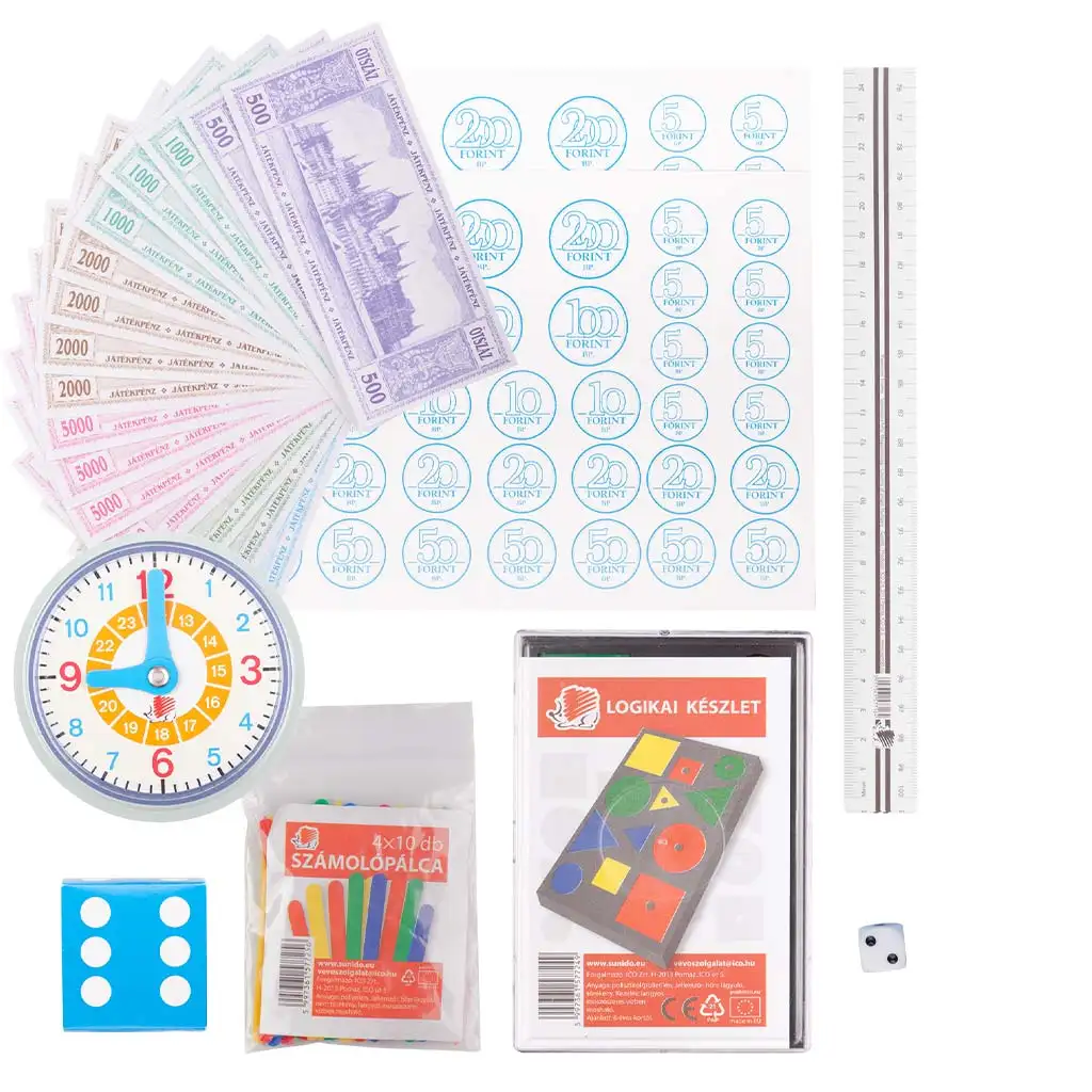 Sada obsahuje barevné plastové školní hodiny, na kterých se děti hravě naučí používat analogové hodiny. Počítací tyčinky a logická sada rozvíjejí dovednosti v počítání a třídění, zatímco hrací kostky a herní penízky umožňují vzrušující hry spojené s učením. S pravítkem se děti začínají seznamovat také už v první třídě, proto je i to součástí balíčku. Použití herních peněz a papírových mincí je skvělou příležitostí k pochopení hodnoty peněz, jejich významu i základních výpočtů.