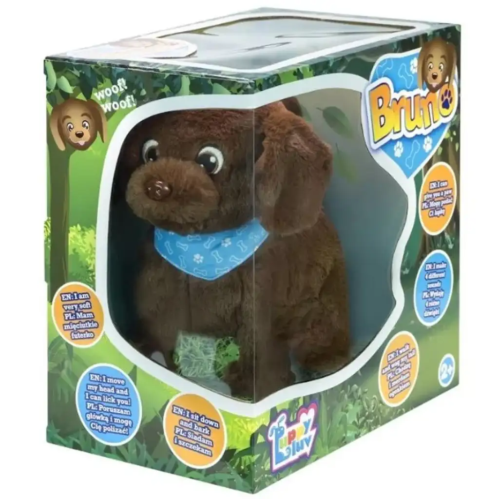 Bruno se díky své hebké srsti a milému výrazu rychle stane oblíbeným u malých dětí. Na krku nosí roztomilý modrý šátek s kostkovým vzorem, který ho činí ještě půvabnějším. Díky snadno ovladatelným interaktivním tlačítkům a pohybům je doporučen již od 2 let, protože povzbuzuje děti k aktivní hře a rozvoji představivosti.