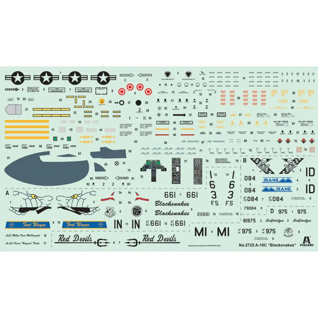 Tento model Italeri v měřítku 1/48 věrně zobrazuje realistický vzhled A-10C s detailním zpracováním. Panelové linie jsou precizně zpracovány, podvozek, kokpit a výzbroj jsou realisticky vytvořeny. Sada nabízí několik možností obtisků, včetně jedinečného zbarvení jednotky Blacksnakes, takže modeláři si mohou vybrat z různých autentických verzí.