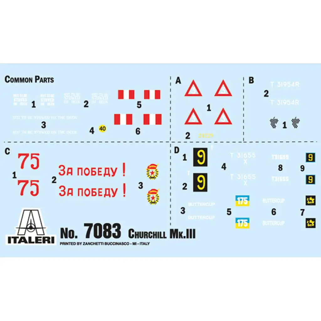 Toto je model Churchill Mk. III od Italeri v měřítku 1:72, který je detailní a přesnou replikou původního tanku. Sada obsahuje jemně zpracované díly, včetně lepitelných pásů a charakteristického pancíře vozidla. Balíček obsahuje figurku, která dále zvyšuje realističnost modelu, a čtyři možnosti obtisků, což umožňuje zobrazení různých britských a spojeneckých jednotek.