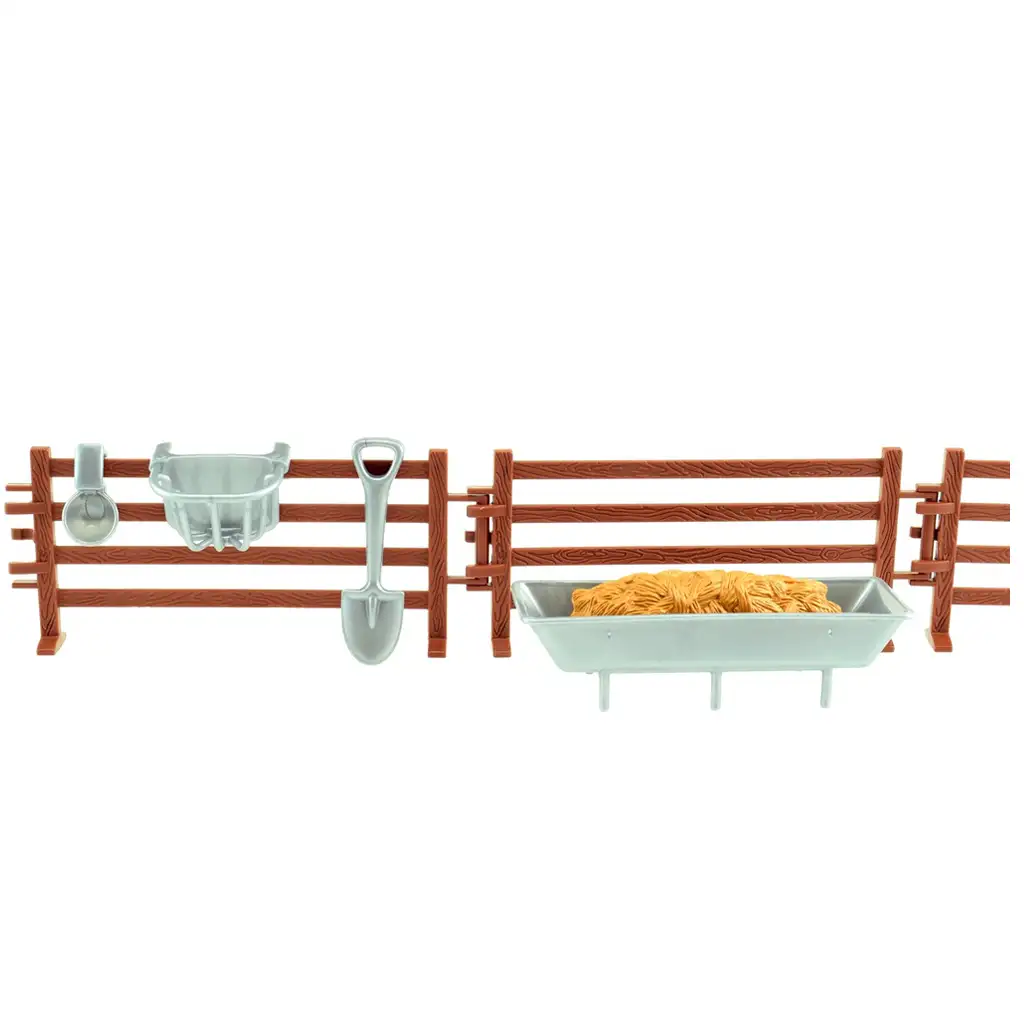 Kůň i jezdec jsou vyrobeni z vysoce kvalitního plastu s realistickými detaily, jako jsou uzda, podsedlová deka nebo jezdecký oděv. Doplňky – například krmítko, seno, lopata, vědro a plot do ohrady – umožňují dětem, aby se o svého čtyřnohého miláčka mohly plně postarat. Sada rozvíjí jemnou motoriku, kreativitu a pečovatelský přístup, zatímco se děti ponoří do světa farmářského života.