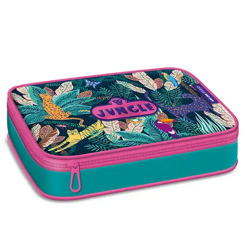 Pouzdro na tužky je pro malé školáky jedním z nejlepších školních potřeb, proto je jeho výběr velmi důležitý. Tento barevný a veselý kousek zdobený vzorem džungle si děti určitě oblíbí, navíc značně usnadňuje organizaci psacích potřeb. Psací potřeby lze upevnit pomocí gumového pásku, který pomáhá udržovat pořádek a organizaci. Celkem je možné uložit třicet psacích potřeb, čtyři gumy nebo ořezávátka a navíc má ještě jednu zvláštní kapsu, do které se vejdou další tužky.