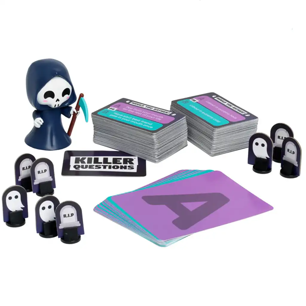 Společenská hra Killer Questions zaručeně oživí rodinná a přátelská setkání! Tato smrtelně vtipná hra na otázky a odpovědi může být velkým úspěchem nejen mezi dětmi, ale i mezi dospělými. Podstatou hry je, že hráči si navzájem kladou otázky, mezi nimiž je i několik opravdu těžkých rozhodnutí – co bys vybral ty? Hru ještě více zpestřuje roztomilá postava Smrti, která pomáhá koordinovat kola.