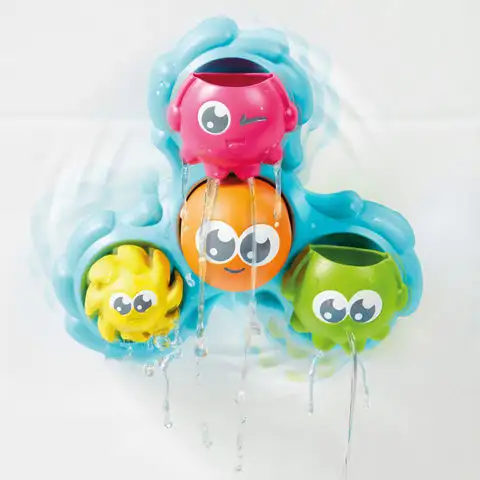 Děti milují otáčivé hry a stříkající vodu. Tato koupací hračka má vše, co je typické pro hračky používané při plácaní. Barevný modrý podstavec připomínající oceán má na zadní straně přísavky, které umožňují bezpečné uchycení uvnitř vany nebo na povrchu kachliček. Veselá a barevná koupací hračka podporuje rozvoj základních motorických dovedností dětí a koordinaci ruka-oko. Hračka může být použita i bez součástí.