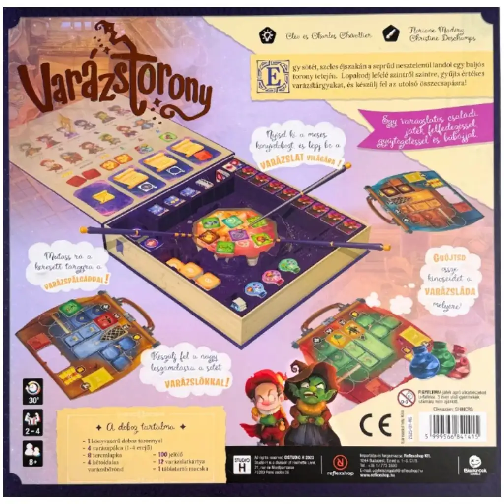 Věža kouzel je pohádková desková hra ukrytá v knižní krabičce, která je snadno naučitelná, ale přesto taktická. Vydáváte se do tajuplné, ponuré věže, kde prozkoumáváte místnosti, shromažďujete cenné kouzelné předměty a připravujete se na závěrečný souboj s temnými čaroději v kryptě. V každém kole si vyberete žeton, který chcete získat, a pak na něj současně ukážete svou kouzelnou hůlkou – správné načasování a chuť riskovat jsou odměněny zlatem, ingrediencemi, zbraněmi a kouzly.