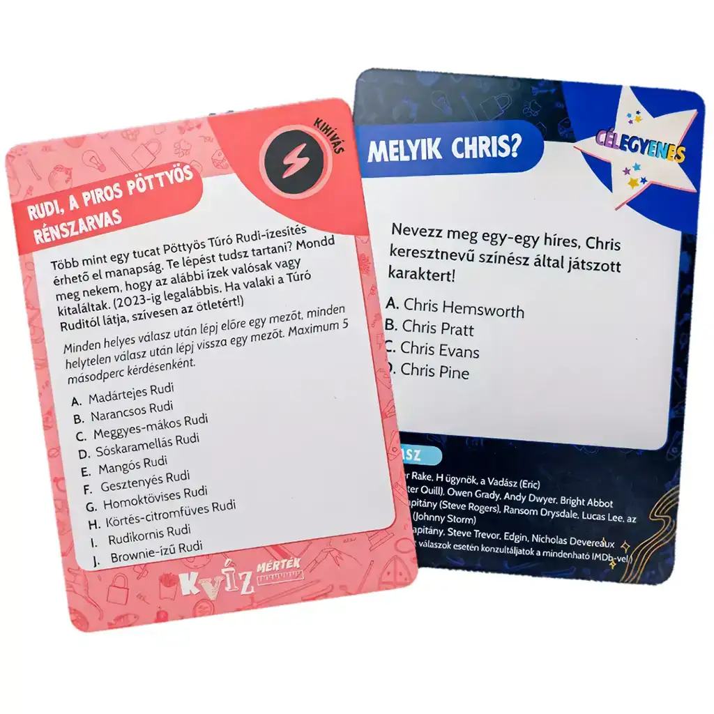 Kvízmérték není jen obyčejná kvízová hra – zde hrají důležitou roli i taktika a týmový duch. Různé karty výzev mohou do hry přinést nečekané úkoly, které dokážou splnit jen opravdu sehrané týmy. A když dorazíte do cílové rovinky, od vítězství vás dělí už jen poslední otázka – ale najde se někdo, kdo se odváží zvolit ten nejtěžší úkol pro konečné vítězství?