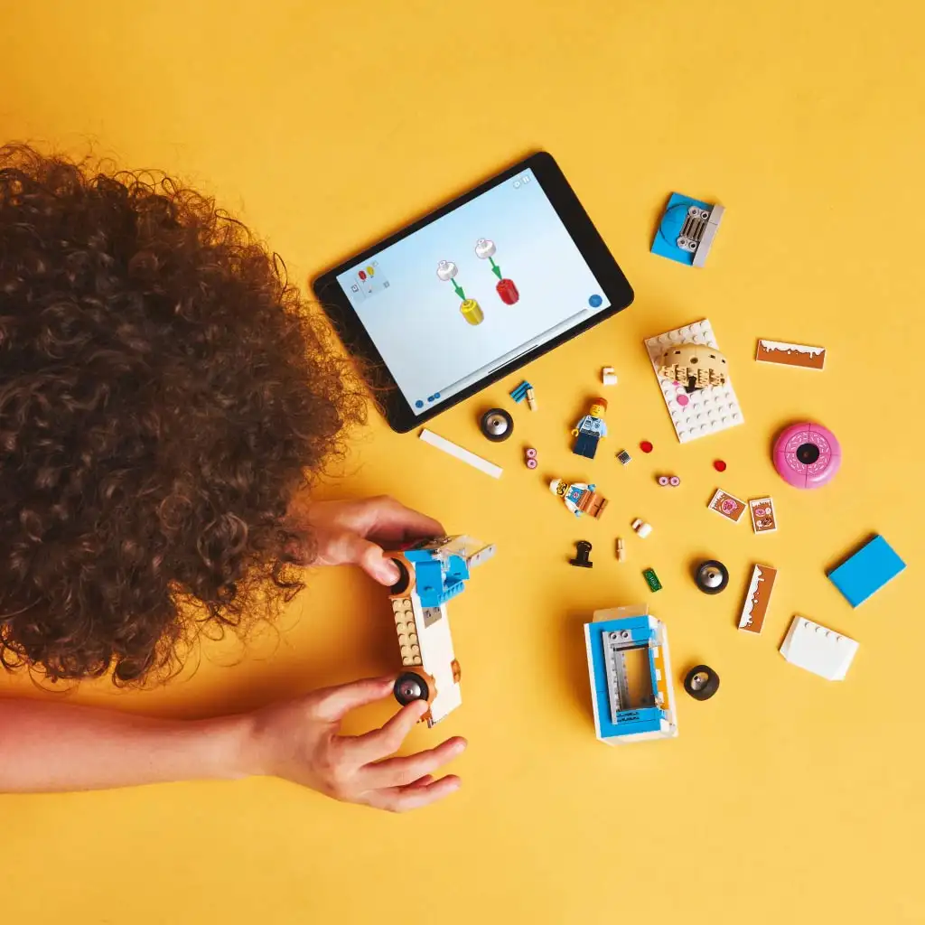 V krabici najdete také návod na stavbu mobilního stánku s koblihami LEGO City. Nebo navštivte aplikaci LEGO Builder, kde děti mohou objevovat a ukládat sady a během stavby přibližovat, otáčet a prohlížet si modely ze všech úhlů.