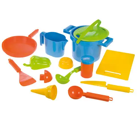 Pokud je hezké počasí, je čas jít ven a na hřišti v pískovišti se skvěle pobavíš s tímto pískovišťovým setem, ve kterém najdeš vše důležité pro přípravu opravdového oběda. Můžeš si také připravit zmrzlinu, pro kterou je zde i kornout a formička na kopečky. V hrnci můžeš uvařit polévku, kde najdeš vše potřebné. Sada svými živými barvami určitě zaujme děti a budou se s ní dobře bavit. Seznámí se s jednotlivými nástroji a trochu nahlédnou do světa vaření.