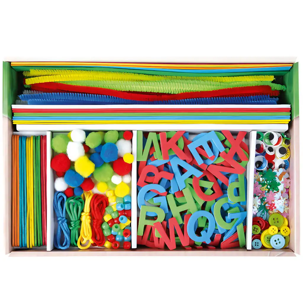Kreativní sada LENA o 400 kusech je mimořádně univerzální a inspirující volbou pro každého malého umělce. Tato sada obsahuje všechny potřebné doplňky pro realizaci kreativních "udělej si sám" projektů. Nabízí bohatý výběr materiálů, včetně kartonového papíru, pěnových desek, chenillových drátů, gumiček a nití, pompomů různých velikostí, korálků, písmenek, knoflíků, pohyblivých očí a různých konfetových výřezů.