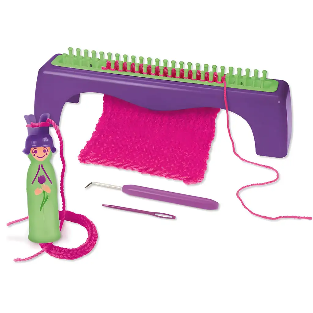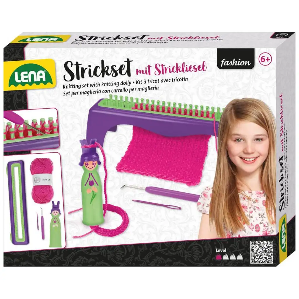 Pletací sada LENA® s přízemi a háčkem nabízí úplný kreativní zážitek pro malé řemeslníky. Tato komplexní sada obsahuje vše potřebné pro vytvoření pleteného projektu, včetně pletacího rámku, pletacího stojanu, pletací jehly, plastové jehly a barevně sladěné pletací příze.