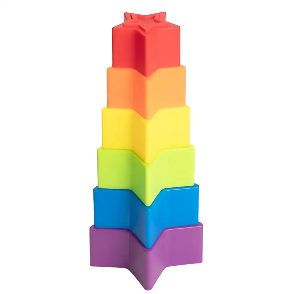 Little Stars Barevné hvězdicové stavebnice je zábavná a rozvíjející hračka, která je ideální pro nejmenší! Tato sada obsahuje 6 různobarevných a různě velkých hvězdicových prvků, které lze skládat na sebe a vytvářet barevnou věž, ale také je lze zasouvat do sebe nebo řadit, aby dítě mohlo vytvářet různé vzory. Tato hračka nejenže poskytuje vzrušující zábavu, ale také rozvíjí jemnou motoriku, zručnost a rozpoznávání barev a tvarů.