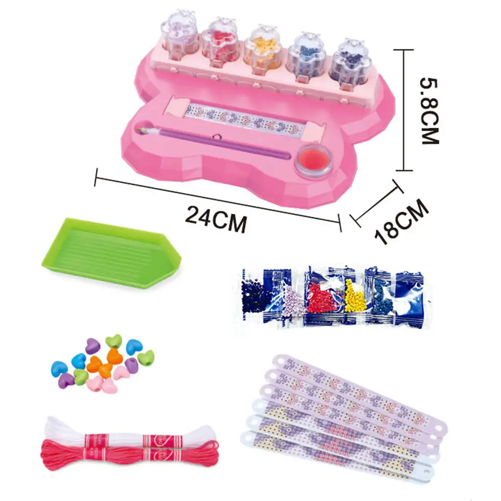 Použití je jednoduché a zábavné: děti nejprve namočí přiložené pero do lepicí hlavičky, pak snadno nabírají korálky a podle zadaného vzoru je umisťují na základ náramku. Díky malé pracovní stanici je vše přehledné a hra se promění v opravdovou „továrnu na náramky“. Hotové náramky jsou originální, barevné, třpytivé – a mohou být i skvělým dárkem pro kamarády či sourozence.