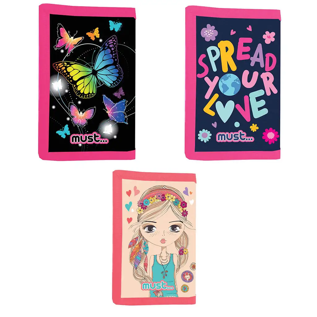 Pokud hledáte stylovou, praktickou a barevnou peněženku pro svou malou dcerku, dívčí peněženka Must je perfektní volbou! Tato jedinečně navržená peněženka zaujme děti nejen svými poutavými vzory – například duhovými motýly, dívčí tváří s květinovým věnečkem nebo veselými nápisy – ale také užitečným vnitřním uspořádáním, které pomáhá organizovat drobné mince, bankovky a další poklady.