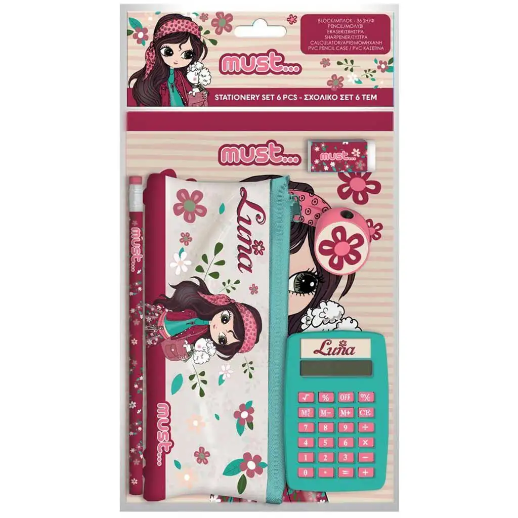 Luna: Sada psacích potřeb pro dívky, 6 kusů, s penálem, kalkulačkou a psacími potřeby.