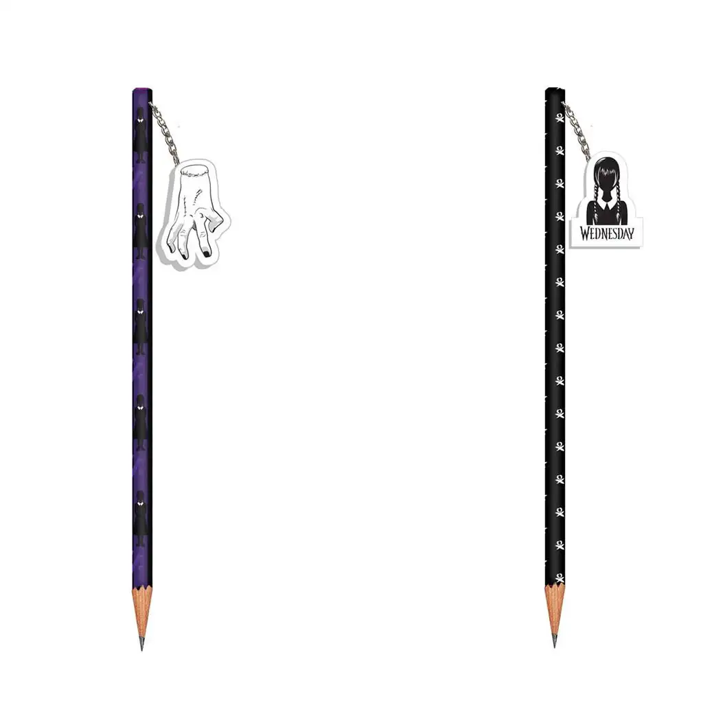 Překvap své dítě, které je fanouškem Wednesday, opravdu jedinečnou a stylovou psací potřebou! Grafitová tužka Wednesday s gumou není jen praktickým školním doplňkem, ale i skutečným vyjádřením stylu. Dostupná je ve dvou variantách: jednu tužku zdobí tajemná a ikonická „Thing“ (ruka), na druhé se objevuje samotná Wednesday Addams – samozřejmě ve svém dobře známém ponurém stylu s motivy lebek.