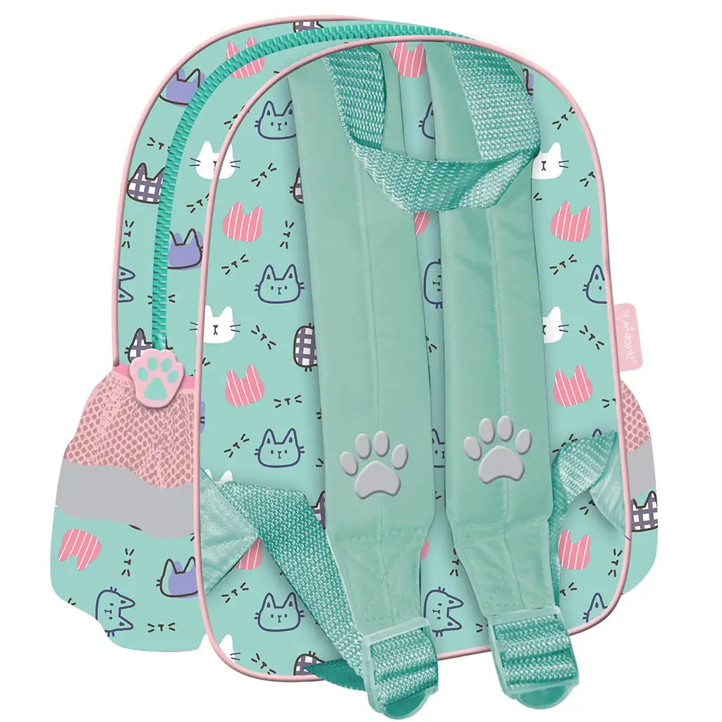 My Little Friend Fluffy Kitty kočičí školkový batůžek 28x25 cm je perfektní volbou pro všechny malé školkáčky, kteří milují roztomilé kočičky a veselé barvy. Batůžek zdobí okouzlující vzor s velkou, roztomilou fotografií koťátka uprostřed přední kapsy, zatímco celý batoh je ozvláštněn veselými kočičími motivy a srdíčky, které ještě více zpestřují jeho vzhled. Růžové a mentolově zelené základní barvy spolu se zipy ve tvaru tlapek dodávají tašce jedinečný a přátelský vzhled, který si děti zamilují.