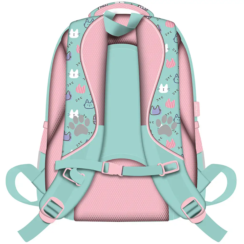 Školní batoh, batůžek My Little Friend Fluffy Kitty BPL58 44x31x19 cm je ideální volbou pro každého školáka, který miluje kočky, veselý a přátelský design a praktická řešení. Hlavním motivem batohu je roztomilá fotografie koťátka, kterou doplňují srdíčka, hvězdičky a hravé grafické prvky. Růžová a mentolově zelená barevnost spolu s roztomilými taháčky na zip s motivem tlapek dělají z tohoto modelu opravdu výjimečný kousek, který si vaše dítě zaručeně oblíbí.