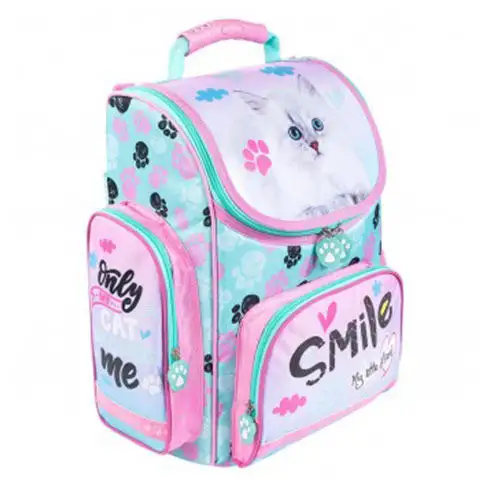 Krásné světlé barvy, kočka namalovaná na tašku, nápis Smile a mnoho otisků kočičích tlap tvoří celkově úžasný školní batoh. Taška se skládá z hlavního oddílu, ve kterém jsou další dvě přihrádky pro lepší oddělení školních potřeb. Kromě toho má taška přední kapsu pro menší věci. Batoh je charakterizován Venti Stream, který zajišťuje proudění vzduchu mezi dětským zády a školní taškou. Uvnitř je štítek, na který může nositel napsat své jméno.