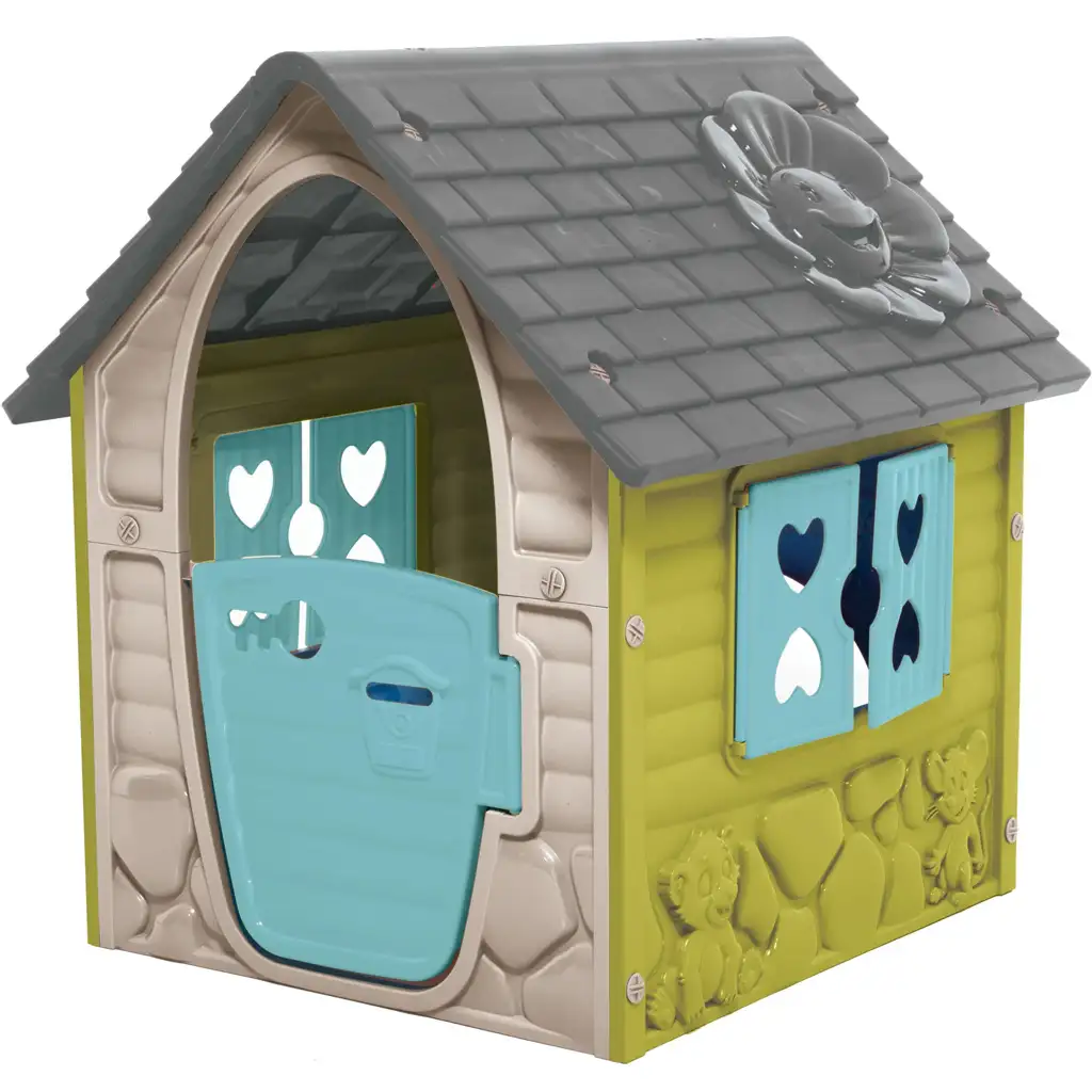 Domeček má přátelský a veselý design: je vybaven polovičními dveřmi s klikou, otevíratelnými okenicemi ve tvaru srdíček a ozdobnou střechou, na které je i usměvavý květ. Na bočních stěnách domeček zdobí roztomilé reliéfy zvířátek, díky nimž je hra ještě lákavější. Masivní, povětrnostně odolná plastová konstrukce je bezpečná a odolná, takže domeček můžete bez obav umístit i na zahradu a to klidně po celý rok.