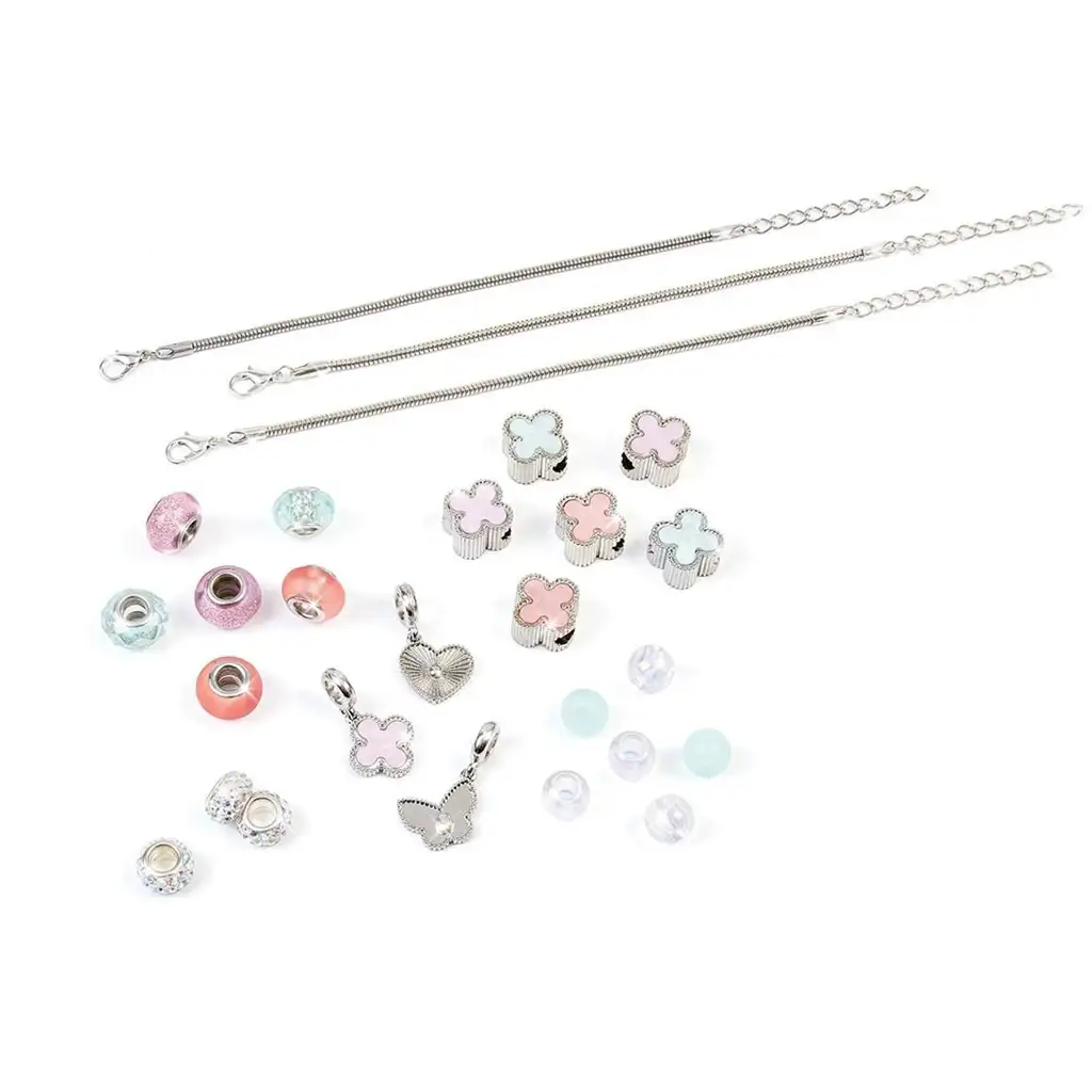 V sadě najdeš třpytivé přívěsky, korálky různých tvarů a barev a tři řetízky, které můžeš libovolně kombinovat. Růžové, světle modré a průhledné odstíny dávají hotovým náramkům jemnou eleganci, zatímco přívěsky ve tvaru srdce a motýla je činí ještě hravějšími a osobnějšími. Sada obsahuje vše, co malý kreativní designér potřebuje – stačí přidat špetku fantazie.