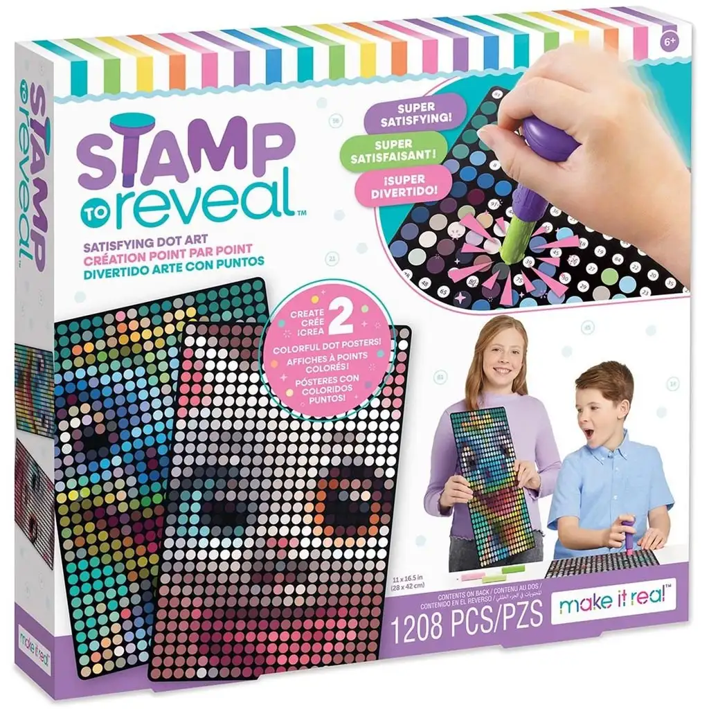 Objev kouzlo tečkovaného umění s Make It Real 2 v 1 Sada razítek na samolepky s tečkami, ve které si děti mohou vytvořit dva opravdu roztomilé a vzrušující plakáty: okouzlující kočičku a barevného dinosaura, jejichž obrázky se postupně objevují tečku po tečce! Díky šablonám označeným čísly se tečky snadno umisťují na správné místo, takže úspěch je zaručen už při prvním tvoření.