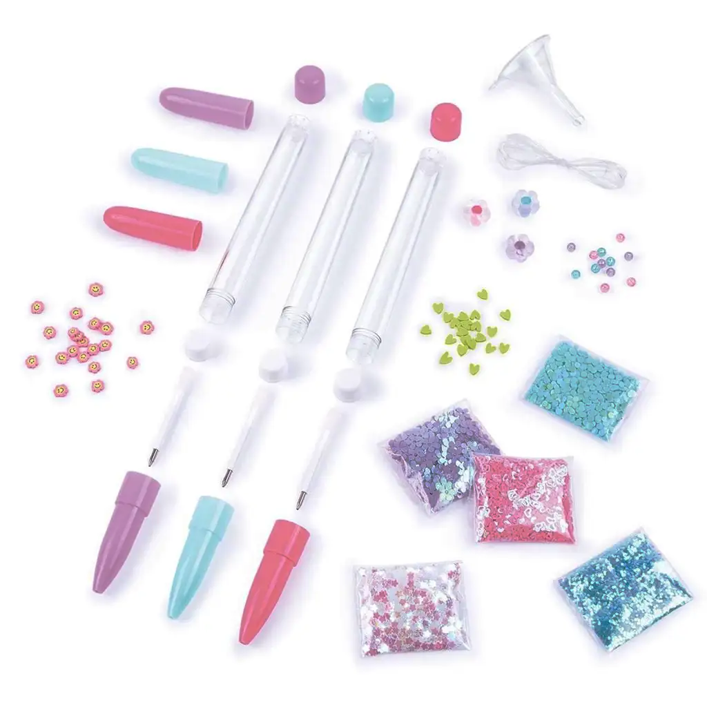 Pomocí mini trychtýře a praktické odkládací misky, které jsou součástí balení, lze těla per snadno naplnit. Dítě si může vybrat z různých ozdob: srdíčka, květiny, puntíky nebo roztomilé usměvavé plátky – žádné pero nebude úplně stejné! Výsledek není jen pastvou pro oči, ale také originálním předmětem, který si dítě může hrdě vzít do školy nebo darovat kamarádce.