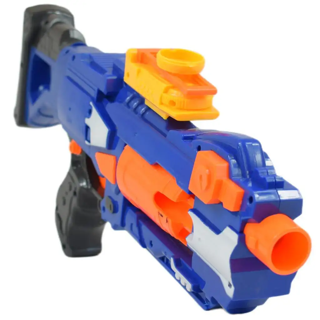 Tato super houbačka přichází v živých barvách pro děti, aby si užily vzrušující hry na přesnou střelbu. S touto zbraní se mohou děti postavit výzvě, ať už samy nebo s přáteli, a soutěžit o nejpřesnější zaměření. Zbraň může být nabitá dvěma různými typy střel: klasické houbové střely a také sada obsahuje střely s přísavkou.