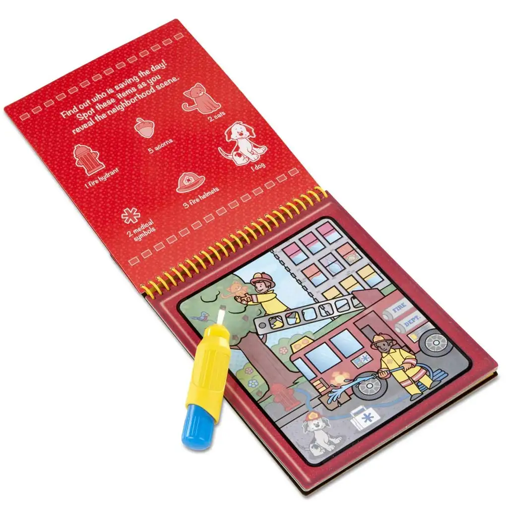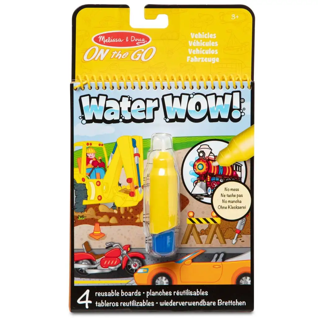 Balení obsahuje pero plnitelné vodou a 4 znovupoužitelné spirálově vázané stránky, které skrývají barevné obrázky a detaily k objevování. Děti stačí, když naplní pero vodou a jak „malují“ stránky, postupně se jim objevují skrytá vozidla, staveniště, hasiči, vlaky a mnoho dalšího. Jakmile strana uschne, obrázek zmizí a zábava může začít znovu – což znamená dlouhotrvající zábavu na cestách i doma.