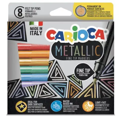 Produktová řada Carioca Metallic obsahuje speciální psací potřeby, jejichž inkoust po zaschnutí vytváří metalický efekt. Tato sada 8 kusů fixů obsahuje několik metalických barev, které umožňují kreslit i na tmavý nebo černý papír díky jejich vysoké krycí schopnosti. Sada je skvělou volbou pro tvorbu speciálních kreseb, barvení nebo dekoraci pro dospělé i děti. Další skvělé produkty z rodiny Metallic jsou také k dispozici v našem internetovém obchodě.
