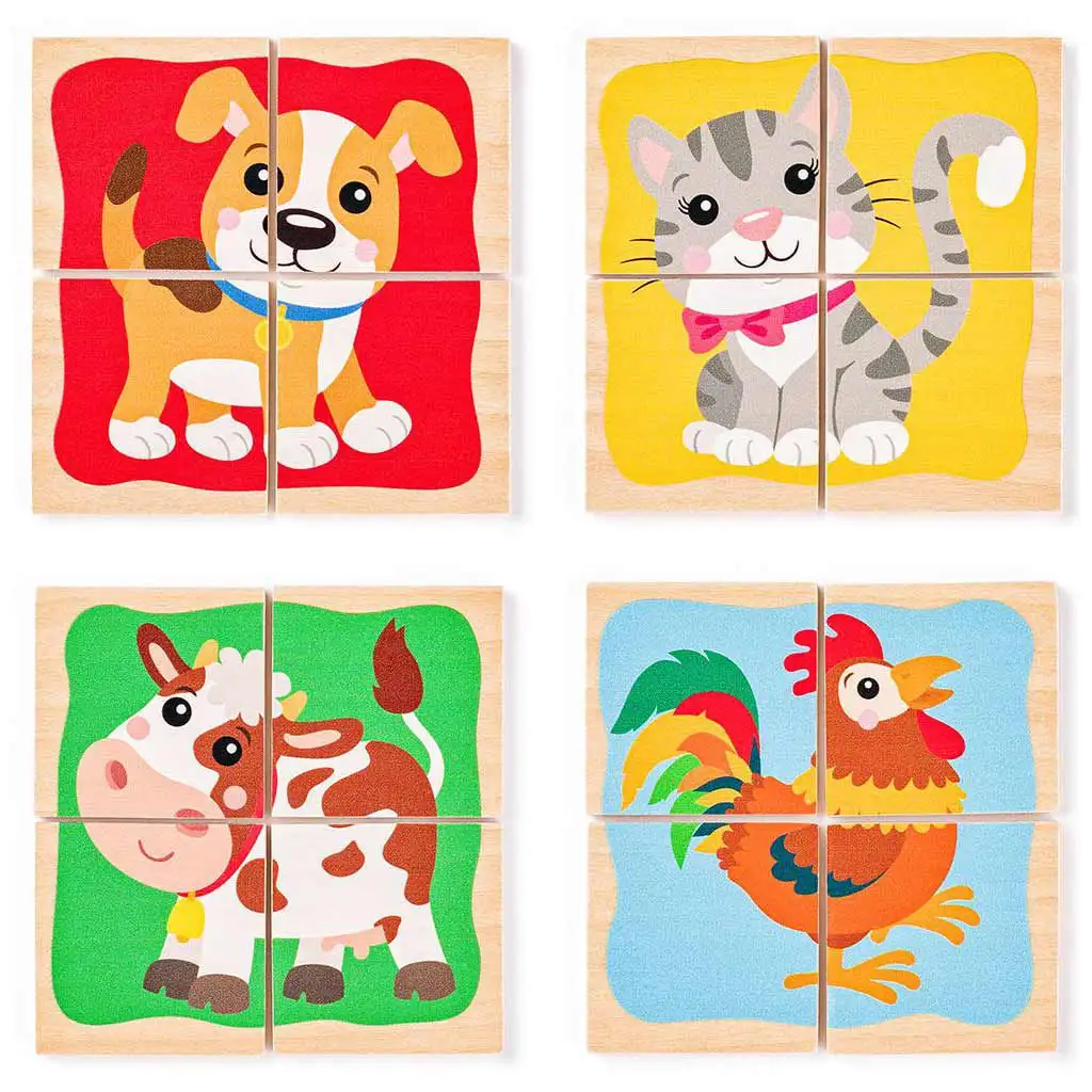 Toto roztomilé, zvířecí mini dřevěné puzzle je ideální volbou pro malé děti, které milují hrát si a učit se zároveň. Puzzle od Woodyland obsahuje čtyři různé milé zvířecí postavičky: pejska, kočičku, krávu a kohouta. Každý obrázek zvířete je rozdělen na čtyři malé kousky, které je třeba složit, což dětem pomáhá rozvíjet jejich zručnost, koordinaci ruka-oko a schopnost řešit problémy.