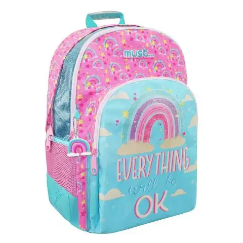 Vše v pořádku, což znamená Všechno v pořádku! To platí pro tuto fantastickou módní školní tašku zdobenou živými barvami. Taška má růžovou a tyrkysovou barvu a na přední straně je vidět motiv oblaků. Její zvláštnost spočívá v tom, že oblaky jsou zcela pokryty reflexní barvou, takže doslova září, jakmile je večer osvětlí zdroj světla. Taška je tak skvělou volbou pro děti, protože je bezpečně použitelná i po setmění. Má 2 větší kapsy a menší přední kapsu, které jsou snadno přístupné a dobře organizované. Ramenní popruhy jsou snadno nastavitelné, materiál je odolný plátno.