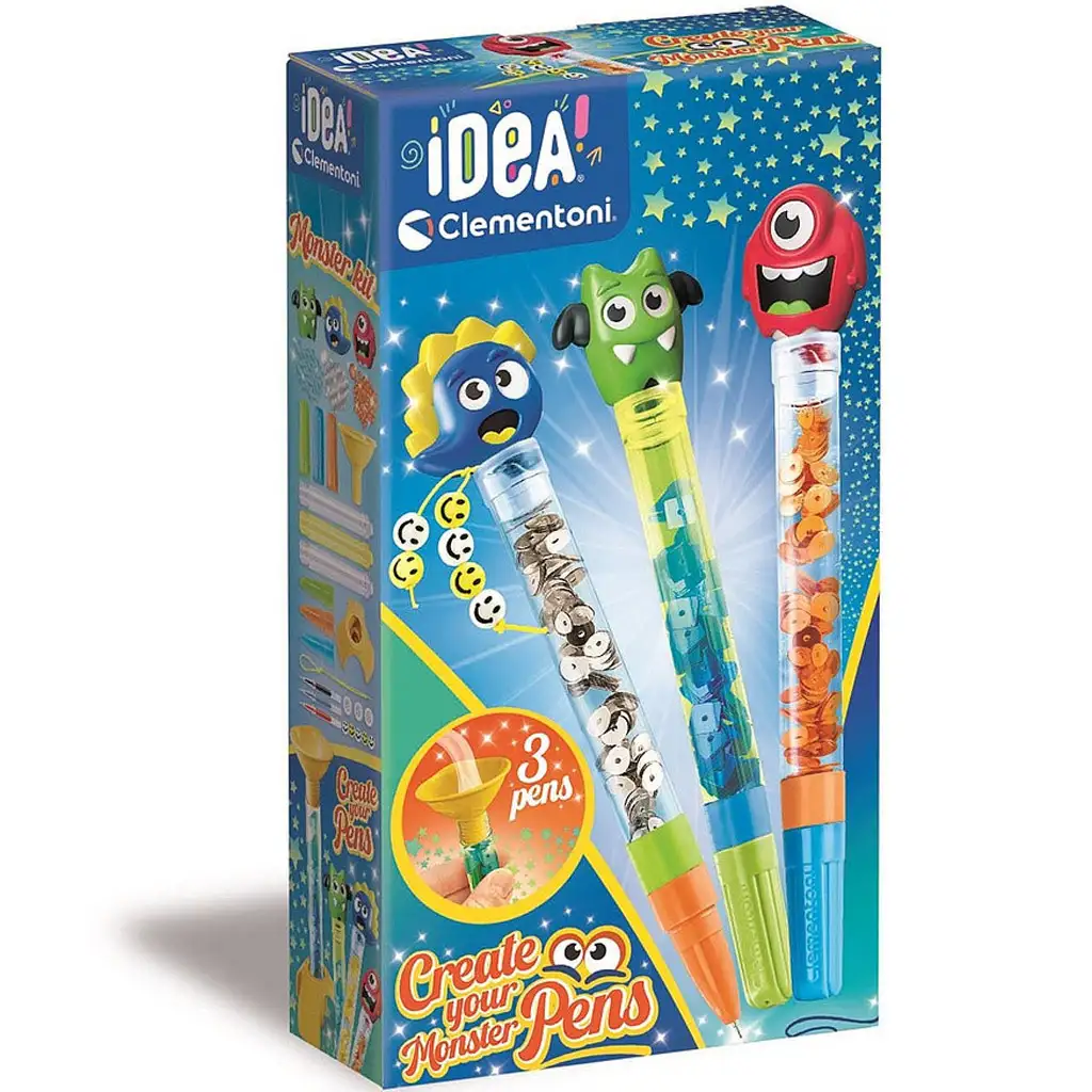 Idea! Sada na výrobu monster per nabízí skutečné kreativní dobrodružství pro každé dítě, které rádo tvoří, zdobí a chce vnést trochu zábavy mezi své školní nebo domácí psací potřeby. Pomocí této sady si může dítě vyrobit tři originální, barevná a legrační „monster pera“ a při tom si hravě rozvíjí svou zručnost a fantazii.