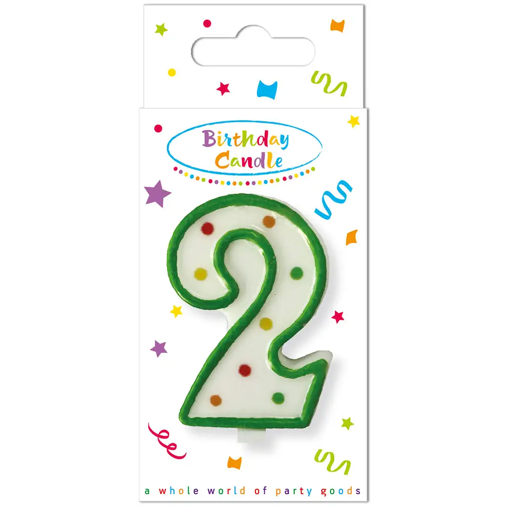 Oslavte druhé narozeniny svého dítěte s touto veselou a barevnou narozeninovou svíčkou ve tvaru čísla 2, která zaručeně vykouzlí úsměv na tváři každého! Svíčka zdobená barevnými puntíky na bílém podkladu má výrazný zelený okraj, takže skvěle vynikne na jakémkoli dortu, muffinu nebo zákusku.