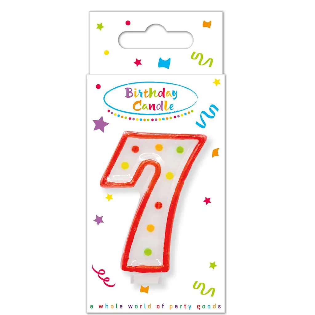 Ozdobte sedmé narozeniny svého dítěte touto barevnou, puntíkovanou svíčkou s číslem 7! Veselá svíčka s bílým podkladem je zdobena barevnými puntíky a červeným okrajem, což vypadá skvěle na jakémkoli dortu – ať už domácím nebo z cukrárny. Svíčka nejenže skvěle slouží jako dekorace, ale také přináší skutečnou slavnostní atmosféru k okamžiku sfouknutí svíček.