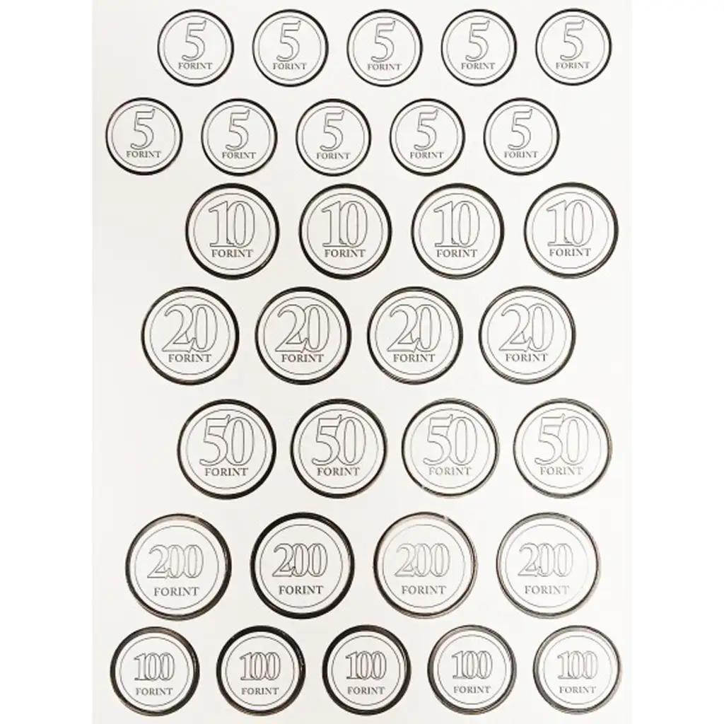 Balení obsahuje bankovky s vysokou nominální hodnotou (20 000 Ft, 10 000 Ft, 5 000 Ft, 2 000 Ft, 1 000 Ft, 500 Ft) a také vystřihovací mince od 5 Ft do 200 Ft. Grafika peněz je detailní a realistická, což ještě více zpříjemní hraní rolových her a zároveň učí.