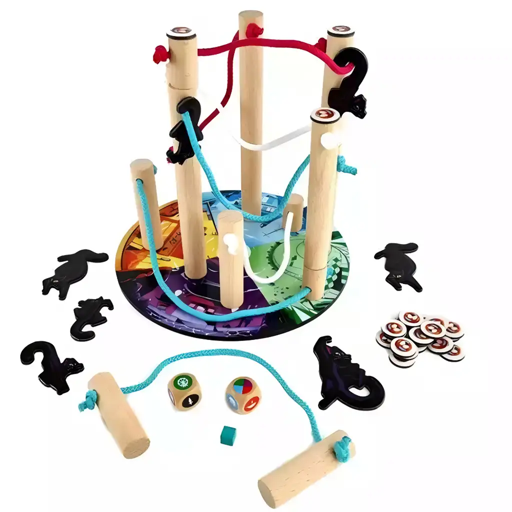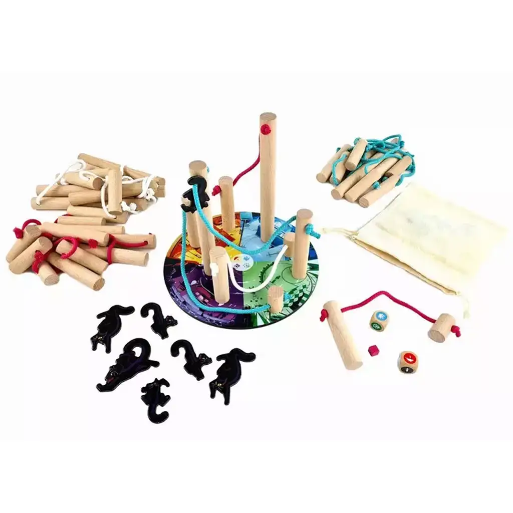 Hra je snadno přenosná, protože všechny prvky se vejdou do praktického sáčku, takže si ji můžete vzít s sebou na dovolenou nebo na setkání s přáteli. Barevná herní deska, různé kočky a dřevěné stavební prvky povzbuzují hráče, aby kreativně a obratně umisťovali předměty, zatímco neustále sledují kroky ostatních.