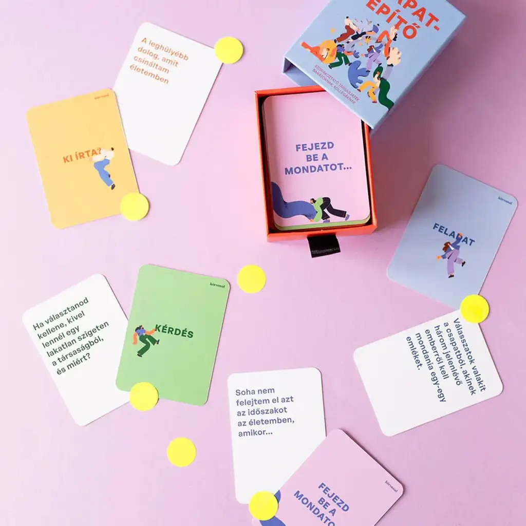 Körvonal – Týmový builder je dynamická a kreativní společenská hra, která pomáhá sbližovat přátelské skupiny, kolegy nebo jakékoli jiné komunity. Tato hra není jen zábavná, ale vytváří také skutečné spojení – díky humoru, hravosti a upřímným projevům. Ať už se jedná o firemní akci, školení, setkání s přáteli nebo dokonce školní program, týmová karetní hra zaručeně nastartuje konverzaci i společné myšlení.