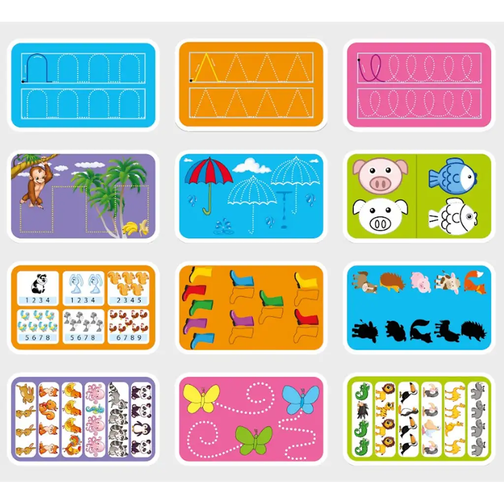 Balíček obsahuje 12 oboustranných, stíratelných karet, které nabízejí různé úkoly. Děti mohou procvičovat vedení čar, párovat tvary, identifikovat stíny nebo řešit jednoduché matematické úkoly. Veselé ilustrace na kartách, jako jsou zvířata, barevné předměty a vzrušující vzory, zaručeně upoutají pozornost malých dětí. Díky přiloženému stíratelnému fixu mohou úkoly opakovaně řešit, což zajišťuje dlouhotrvající zážitek.