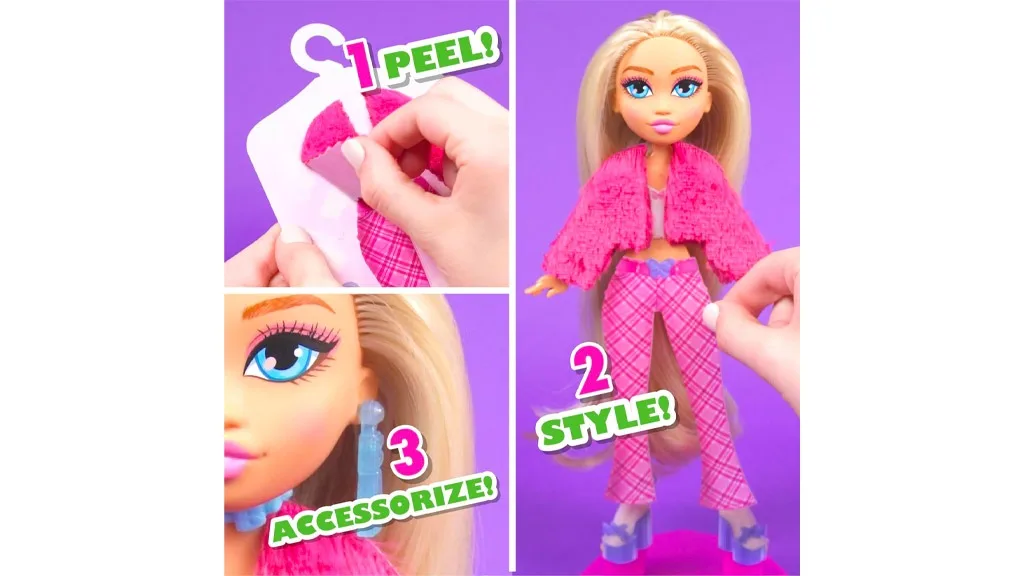 Každá plochá panenka přichází s několika znovu použitelnými nálepkami na oblečení. Tyto šaty visí jako nálepky ve skříni, která je součástí balení, takže děti mohou snadno procházet. Každý z šesti archů nálepek obsahuje kompletní oblečení (vrchní díl, spodní díl, doplňky a boty), ale děti mohou díly libovolně kombinovat, čímž vytvoří nespočet kombinací. Nálepky lze snadno odlepovat a přilepovat, ale mladší děti mohou potřebovat trochu pomoci. Sada obsahuje také nástroj, který usnadňuje odlepování a přilepování oblečení!