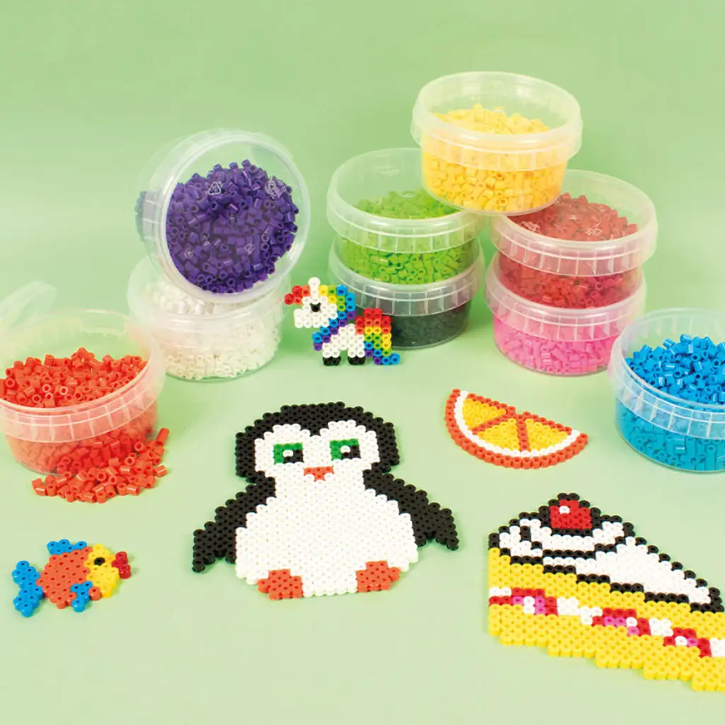 Sada obsahuje bílé, černé, žluté, červené, modré, zelené, fialové, oranžové a růžové korálky, které jsou dodávány v praktických, znovu uzavíratelných plastových nádobkách, takže je snadné je uspořádat a skladovat. Větší, 9mm velikost usnadňuje uchopení a umístění korálků, což je ideální volba i pro menší děti.