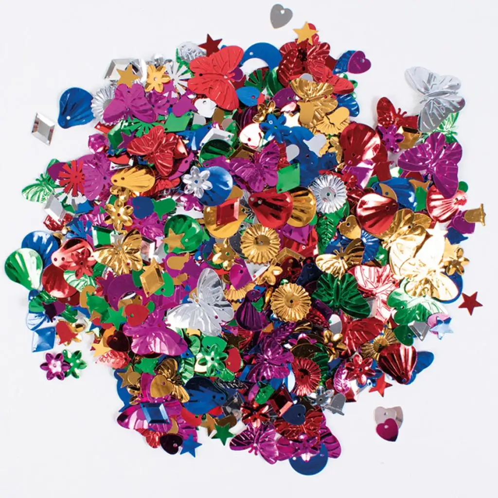 Balíček obsahuje různé vzory, jako jsou motýli, hvězdy, květiny, mušle a srdce, takže pro každý projekt najdete ten správný doplněk. Flitry mají průměr 6 mm, což je ideální velikost pro detailní a propracované dekorace.