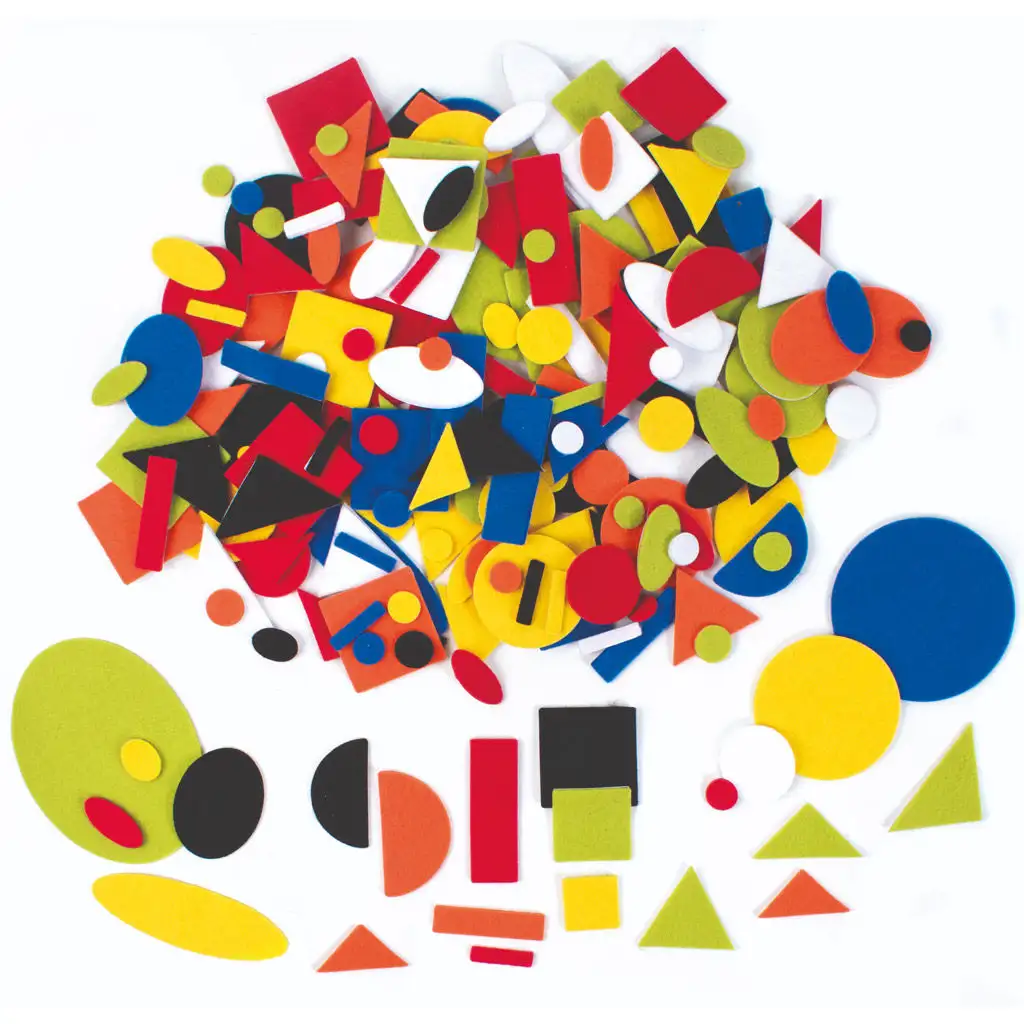 Geometrické tvary z filcu nabízejí samolepicí řešení pro kreativní projekty. Nejběžnější tvary, jako jsou kruhy, čtverce, obdélníky a trojúhelníky, lze snadno přilepit na požadovaný povrch.