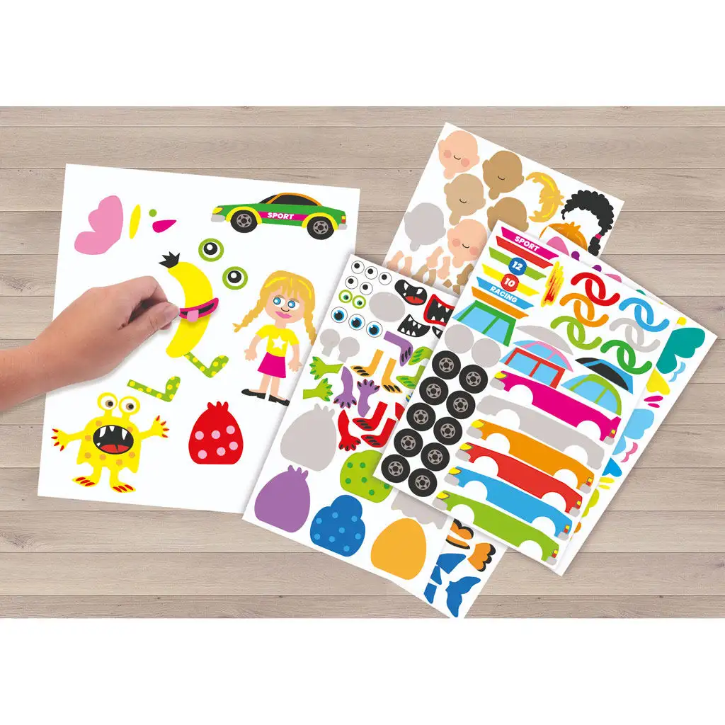 Vytvořte jedinečné a osobní motivy kombinací samolepek! Vyberte si požadované části těla, ruce, nohy, ústa a oči, abyste vytvořili svou vlastní kompletní postavu. Možnosti tvorby jsou téměř nekonečné: můžete vytvořit děsivého monstra, barevné letadlo, veselou rybu, ovocné postavičky, zvířata nebo dokonce vozidla.