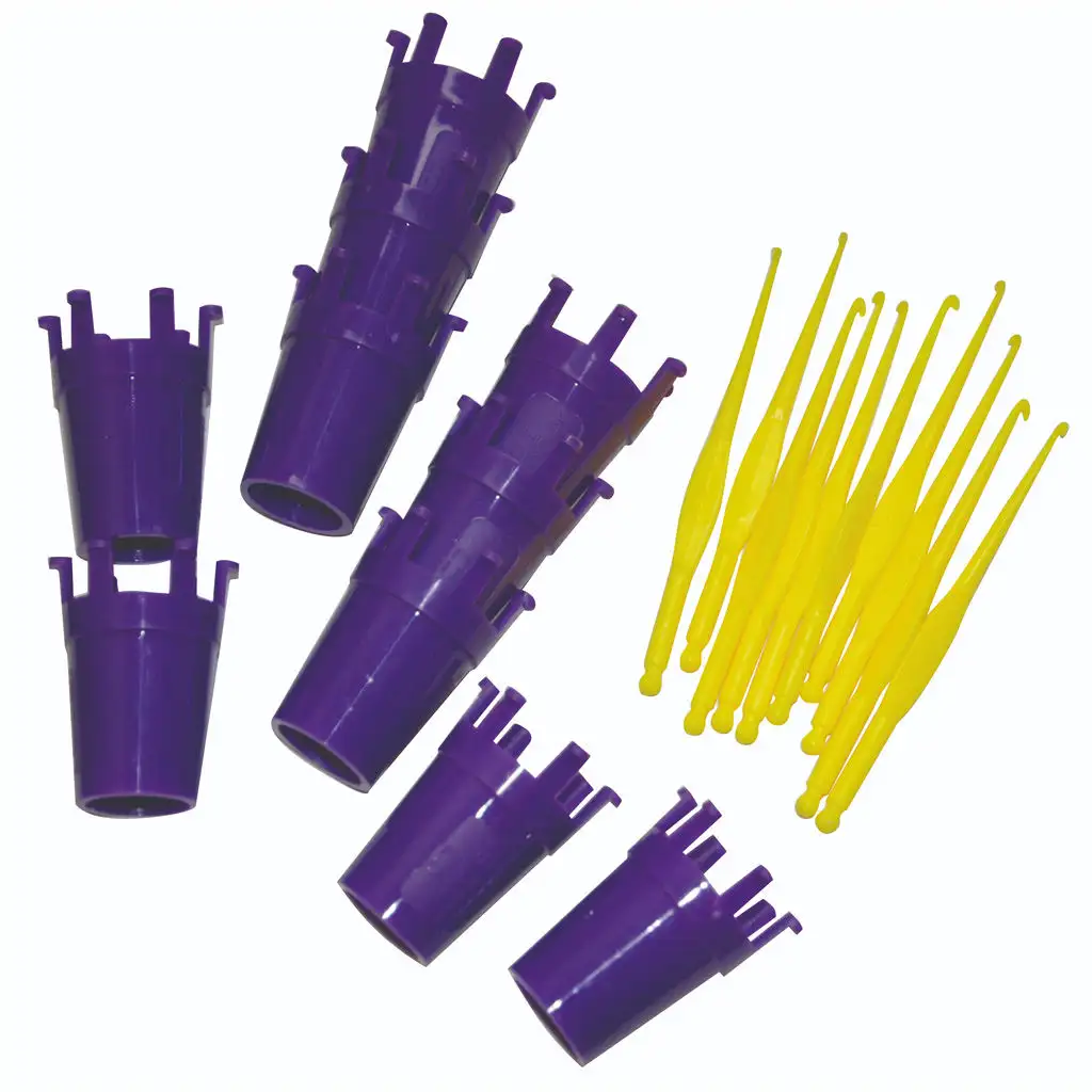 Velikost kroužků je 30 x 40 mm, zatímco háčky mají rozměry 85 x 4 mm. Všechny nástroje jsou dostupné v fialové a žluté barvě, což přidává více barev a rozmanitosti vašim výtvorům.